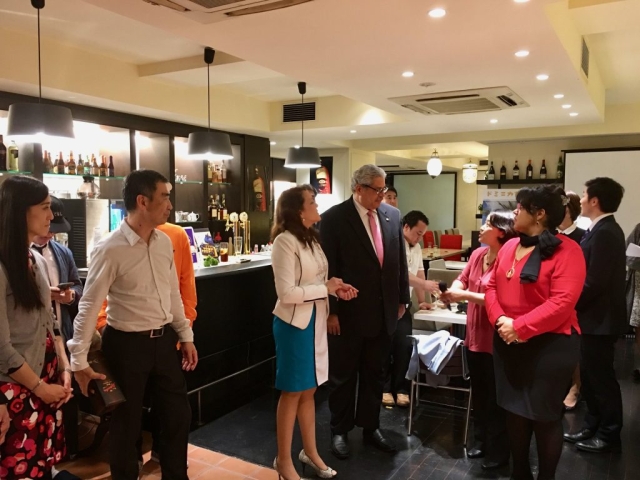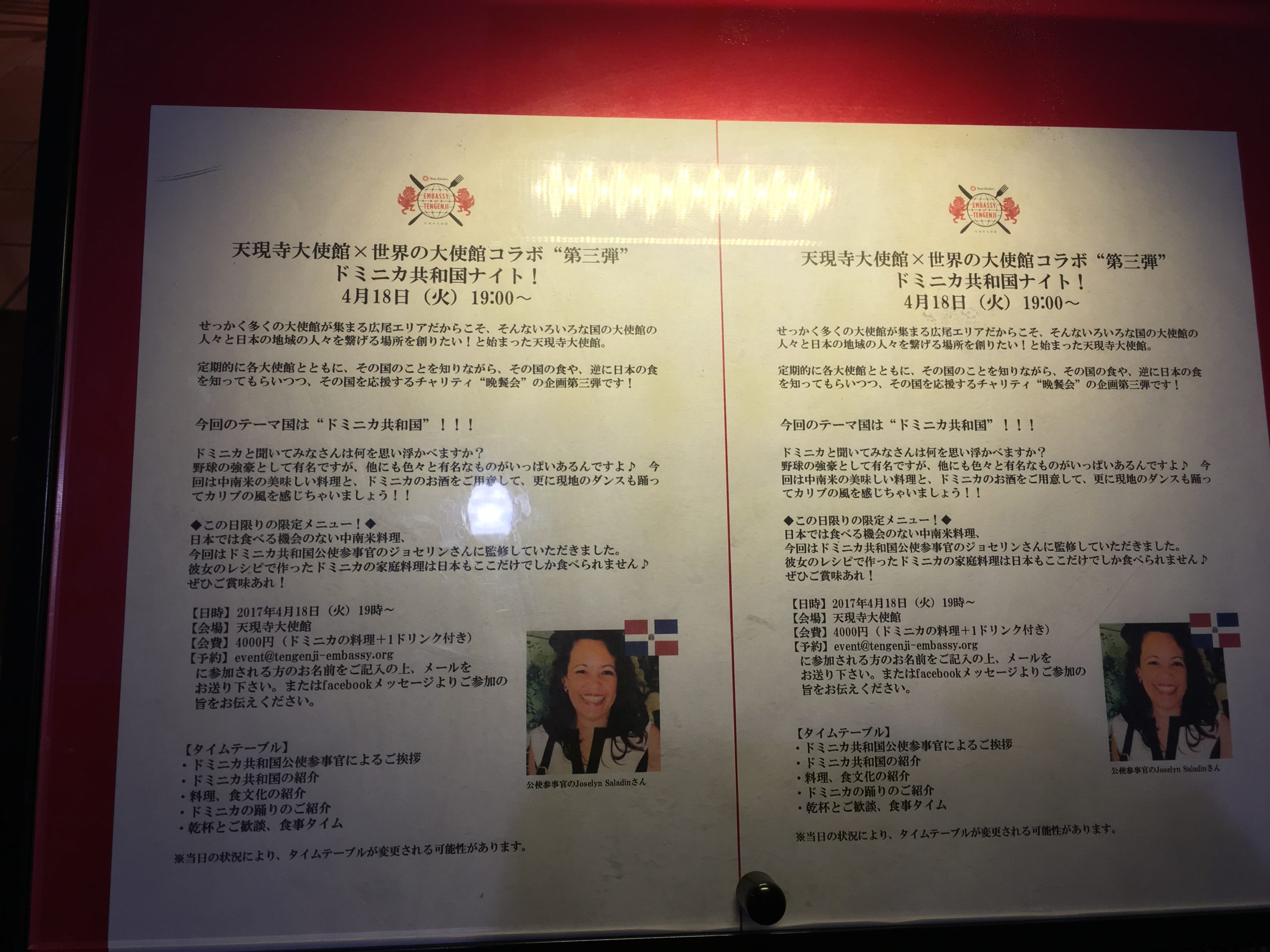 4月18日(火)、「天現寺大使館」レストランにて、ドミニカ共和国の家庭料理をフィーチャーした「ドミニカン・ナイト」が開催されました。「天現寺大使館」は“食で地域と世界を繋ぐこと”を目的としたレストランで、今回「大使館シリーズ」の第二回目として、駐日ドミニカ共和国大使館の協力の下、皆様にドミニカン料理を振る舞われました。エクトール・ドミンゲス駐日ドミニカ共和国特命全権大使のご挨拶、ジョセリン・サラディン駐日ドミニカ共和国大使館公使参事官のドミニカ共和国に関する説明のあと、当協会及びドミニカ共和国産カカオを利用したチョコレートを販売されている株式会社明治さまのドミニカ共和国における取組についてご発表がありました。その後、ビュッフェスタイルでドミニカン料理を楽しみ、皆でメレンゲダンスを踊りました。男女それぞれベストダンサーが選ばれ、高級ドミニカ共和国産ラム酒が賞品として授与されました。中々普段触れることが無い料理とダンスに皆様心より楽しんでおられた様子で、当協会も同様のイベントを行ってゆきたいと思います。皆様お疲れ様でした〜。