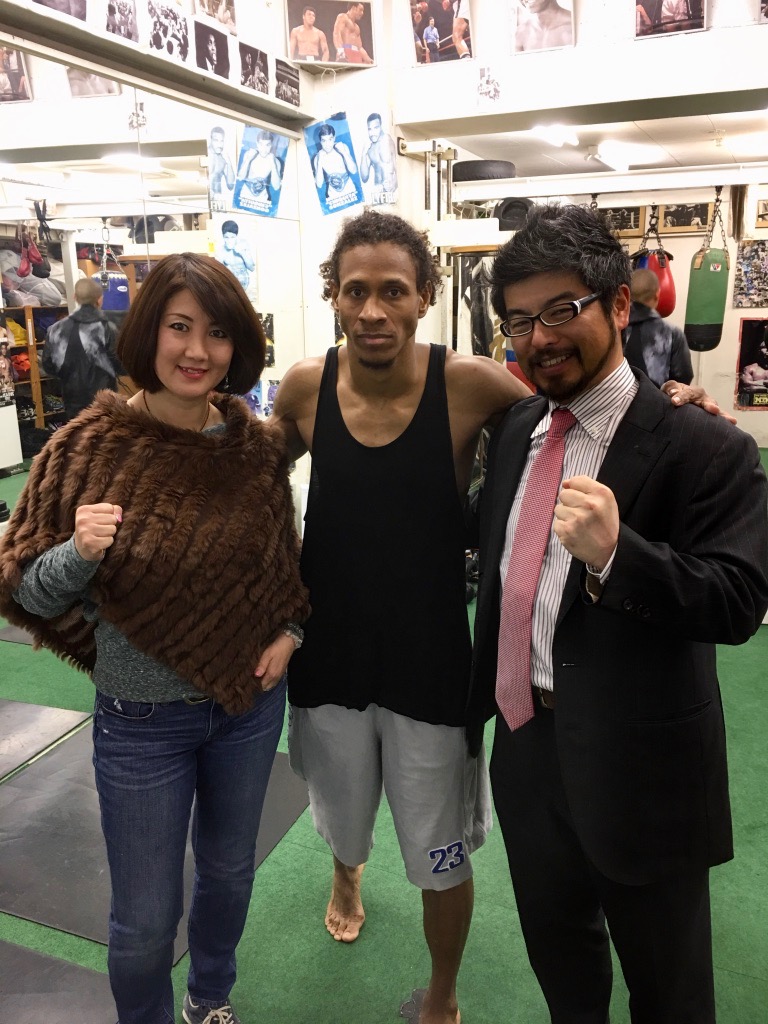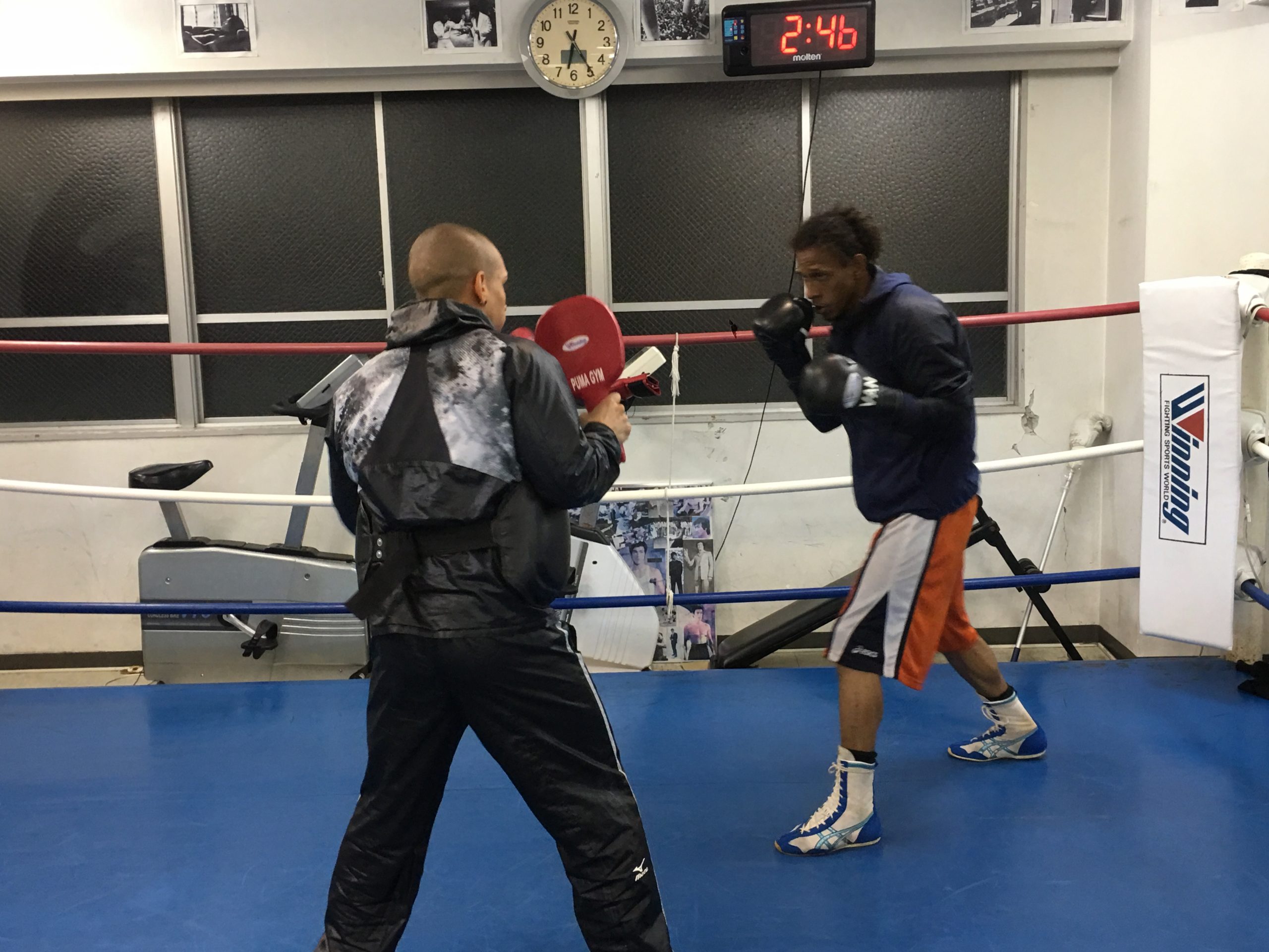 去る3月29日(水)、ドミニカ共和国の元オリンピック代表で、元ドミニカ共和国スーパーライト級チャンピオンであるブラディミール・バエス選手の練習風景を見学に、ピューマ渡久地ジムに行ってまいりました。バエス選手は4月21日(金)後楽園ホールに行われる「第64回三迫ボクシングジム一門会」のメインイベントに、日本スーパーライト級4位の永田大士選手(三迫ジム所属)と対戦します。バエス選手は、ドミニカ共和国でボクサーとして長いキャリアを積んだ後(通算21勝3敗2分)、世界チャンピオンになるチャンスを求め、日本にやってきました。そのリングネーム(デスティノ・ジャパン)が示すとおり、日本を最終目的地として、世界チャンピオンを目指します。4月21日のチケットは多少残っているそうなので、当協会もしくはピューマ渡久地ジム(03−3583−6007)までお問い合わせ下さい。チケットはVIP席(リングサイド):1万円、A席:7,000円、B席:5,000円、となっております。是非皆さんでバエス選手を応援しましょう!