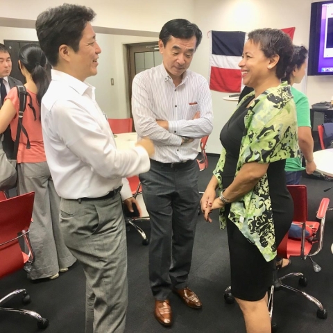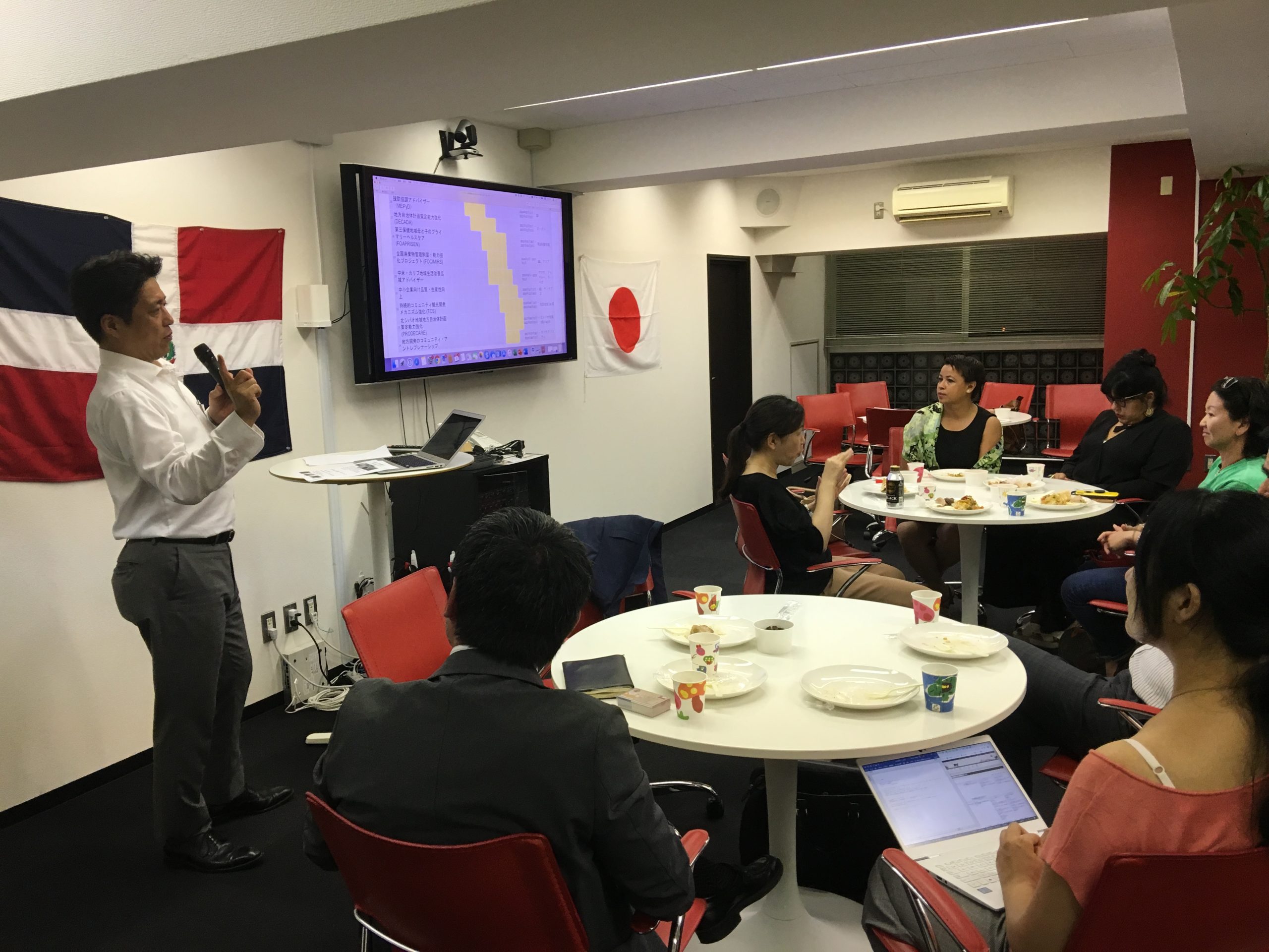 9月4日(水)、近藤貴之JICAドミニカ共和国所長をお招きし、「第4回ドミニカン・スピーカーズ」を開催致しました(山田前所長、近藤様をご紹介頂き誠に有難うございました)。平日の夜にも関わらず、アレクサンドラ・アルバレス駐日ドミニカ共和国大使夫人や松戸市役所の職員の方々も含め、計20名の方にお越し頂きました。近藤所長からは、日本(JICA)の有償・無償、技術協力からボランティアの派遣に関わる様々なタイプのプロジェクトについてご説明頂きました。印象深かったのは、ドミニカ共和国の経済発展に伴い、支援内容も変化して行ったことでした。例えば、1990年代初期からは、消化器医療関連や日本・ドミニカ共和国友好医療教育センターの建設や算数教育プロジェクト、農業開発などの「プライマリーレベル」の協力を行い、最近はプラスチックゴミの廃棄や首都の交通渋滞、防災や地域開発まで「グローバルな共通の課題」について協力を行っているとのことでした。また、ドミニカ共和国コンスタンサ市に「20世紀梨」の生産協力を行っている松戸市の白井文化観光国際課長からも簡単なプレゼンテーションを行って頂きました。最後にアルバレス駐日ドミニカ共和国大使夫人から日本のドミニカ共和国に対する協力につき、謝意が述べられました。皆様から多くの質問が出たように、ドミニカ共和国を国際協力の観点から知って頂く、非常に貴重な機会であったと思います。ご帰国の翌日にも関わらずご登壇頂きました近藤所長に心より御礼申し上げます。最後にお料理を出して頂いたEduardo Ferradaさん、有難うございました。