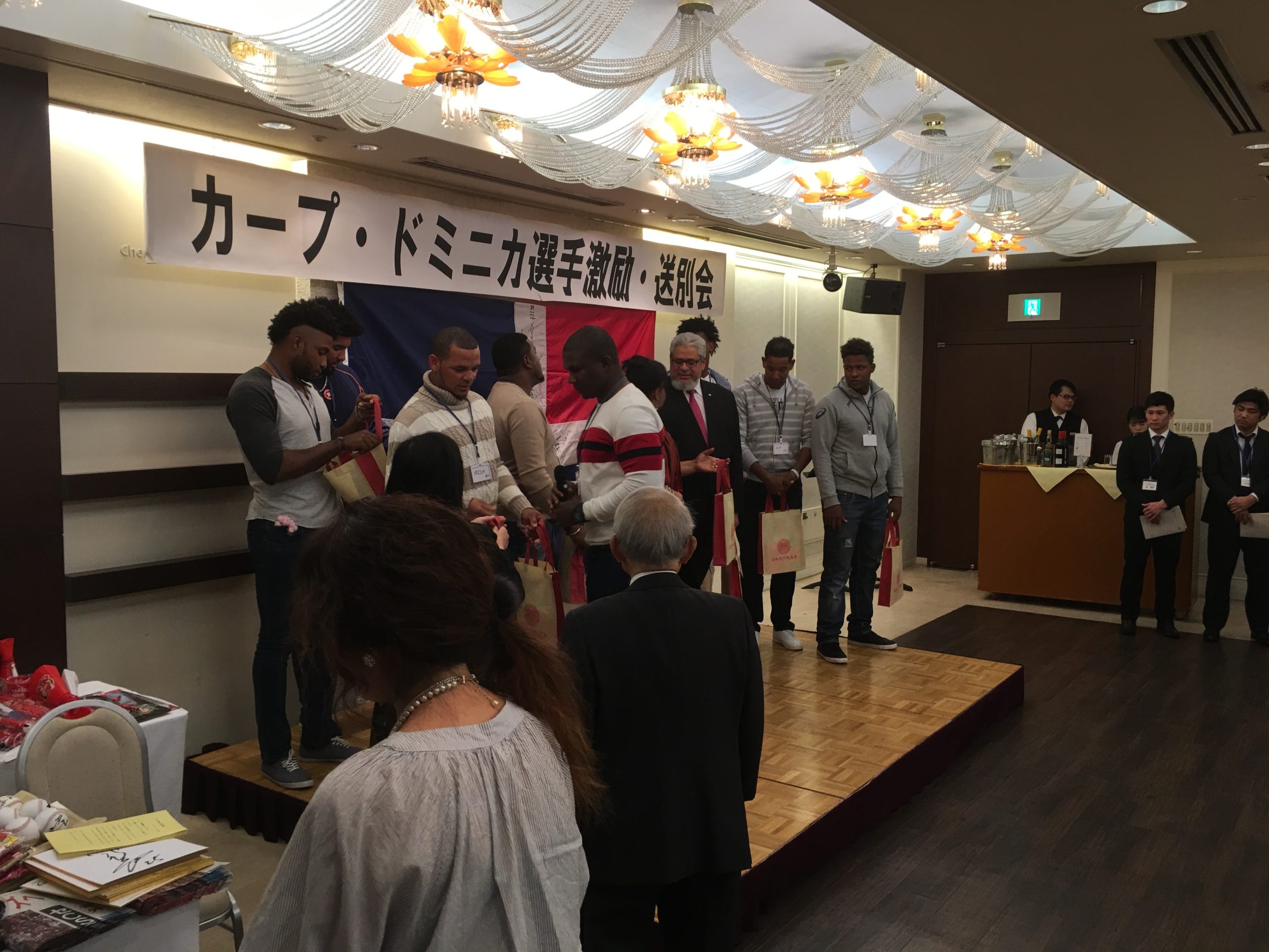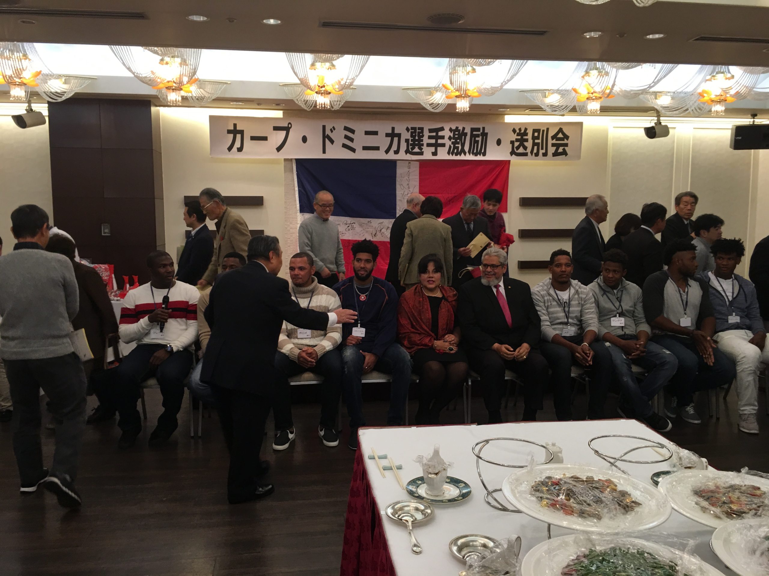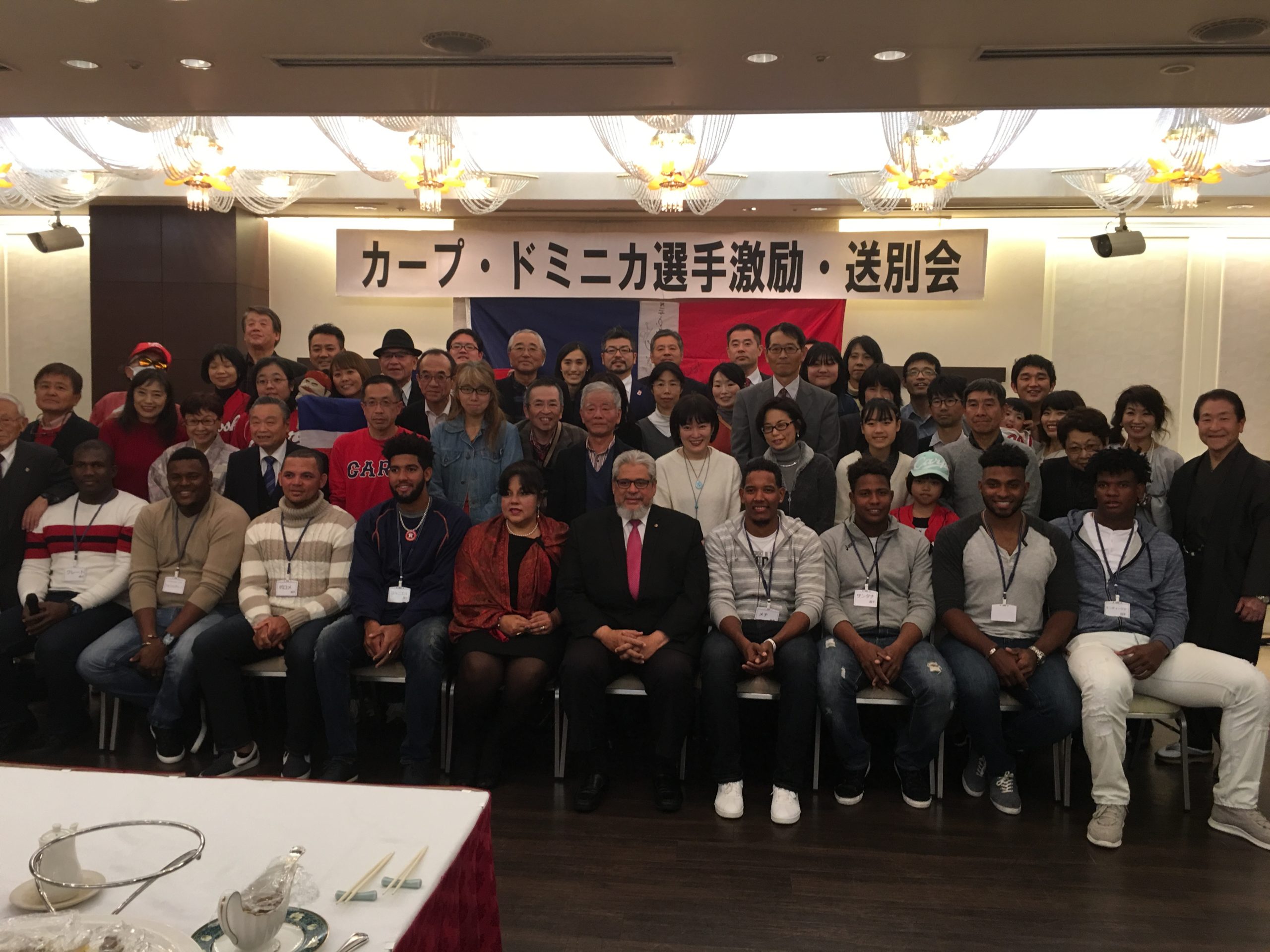11月23日、北広島町訪問後、引き続きドミンゲス駐日大使閣下をお連れして、広島市内に移動し、「カープ・ドミニカ選手激励・送別会」に参加して参りました。同会は、広島東洋カープ球団がドミニカ共和国に有する「ベースボール・アカデミー」出身の選手を励ましつつ、契約の関係上帰国せざるを得なくなった選手たちを送るための会として、1995年以来続いております。今回当協会は初めて本会にお招き頂きました。ドミンゲス大使からドミニカンプレーヤーへの温かい励ましと、ドミニカ人選手たちをサポートして頂いている広島東洋カープ球団及び関係者の皆様への感謝のご挨拶があった後、ドミニカンプレーヤーの紹介、余興、スピーチ、カープグッズ抽選会などがあり、非常に盛り上がった会となりました(90名以上の方々がご参加されました)。当協会としても、カープ及び各NPB球団で活躍するドミニカンプレーヤーの祖国である「ドミニカ共和国」を知って頂くための活動を積極的に行ってゆく所存です。引き続きのご支援のほど、宜しくお願い致します。