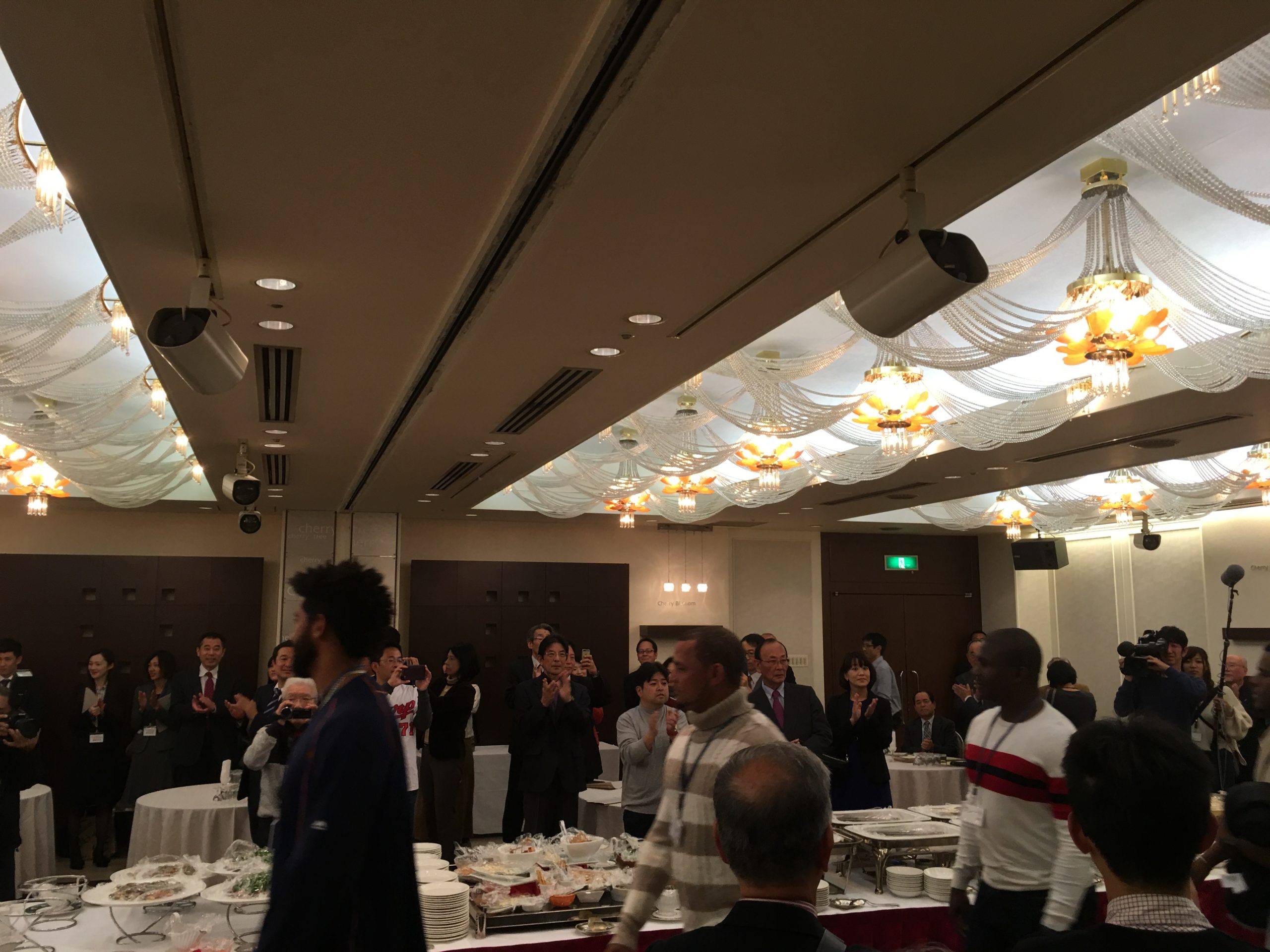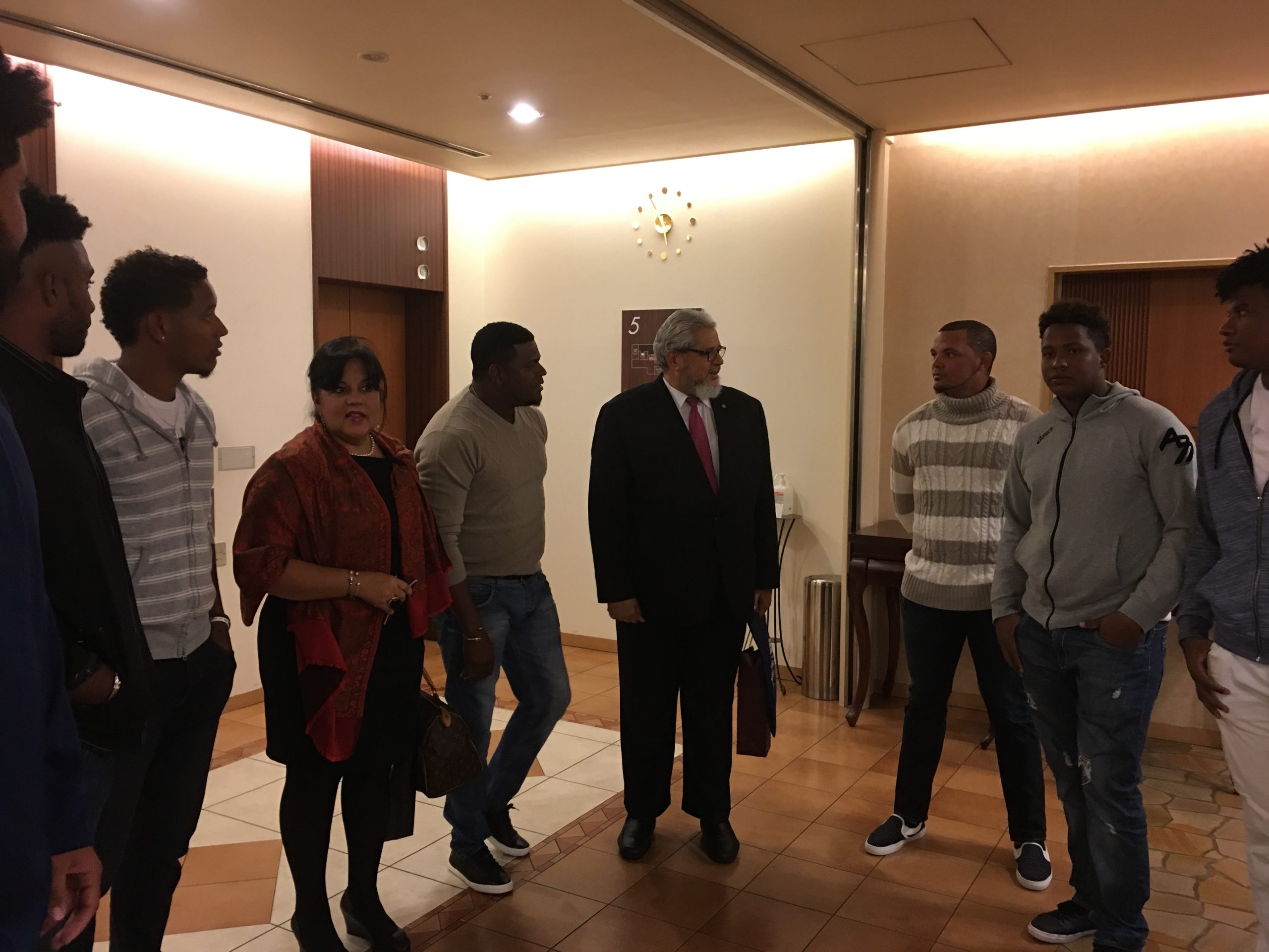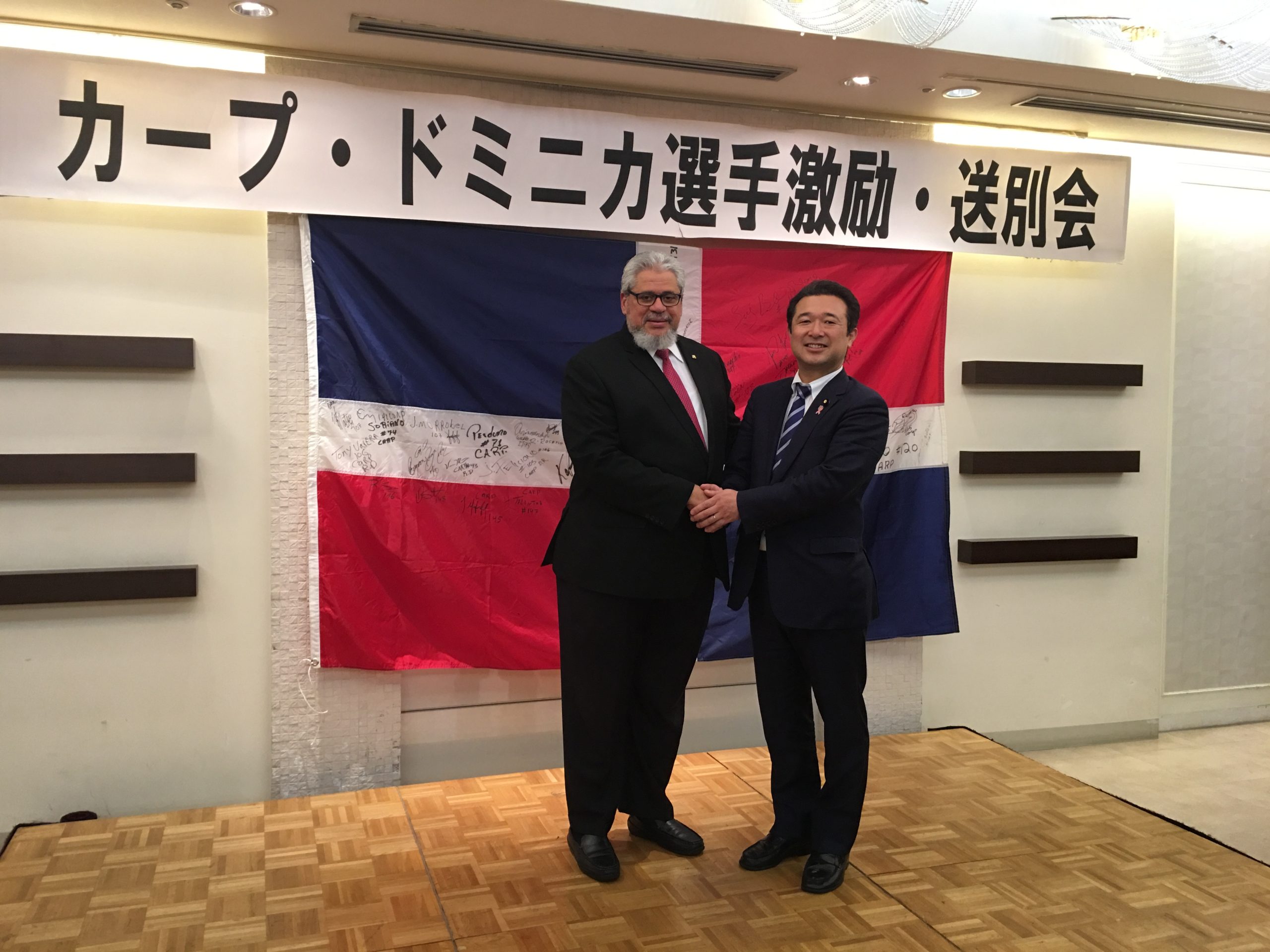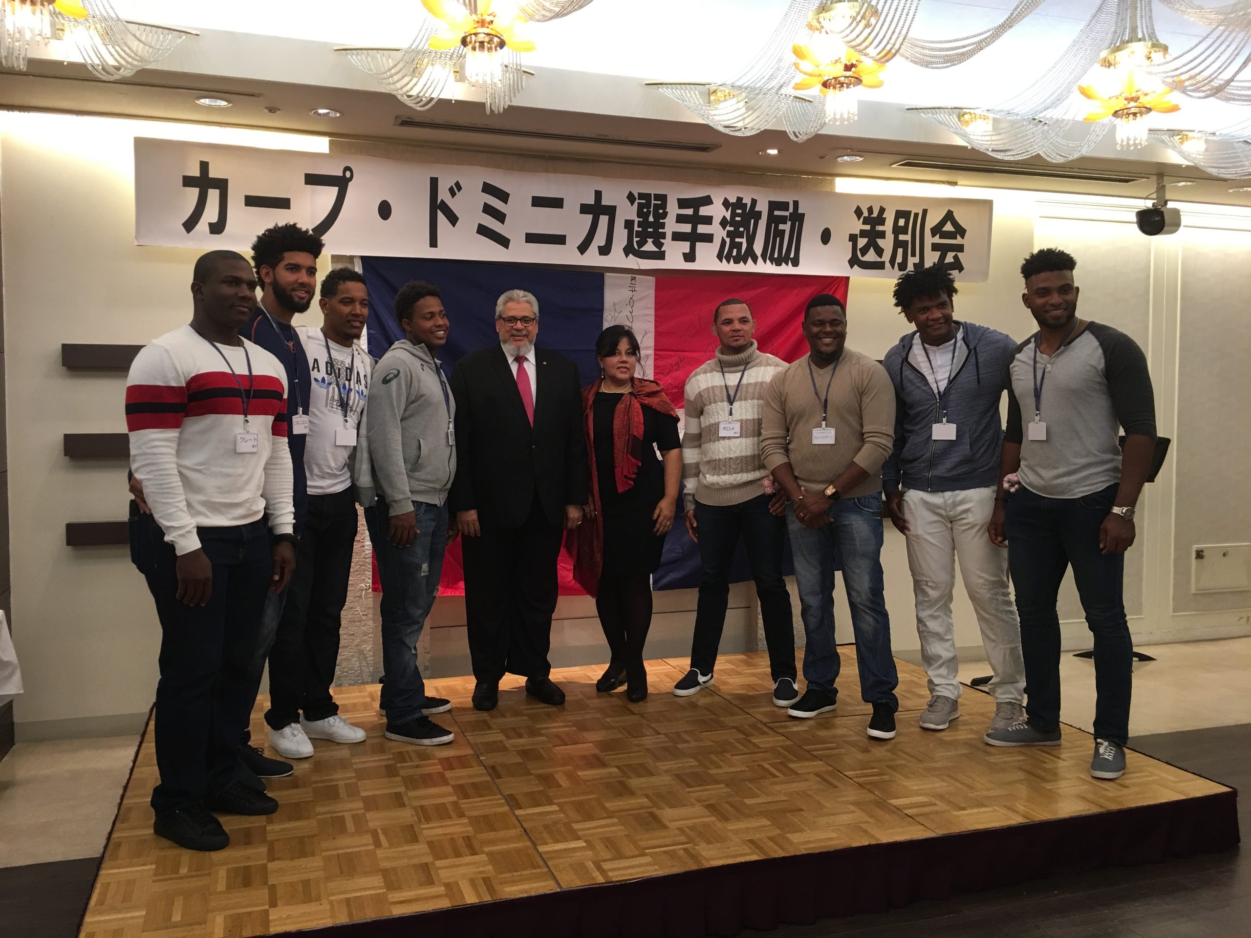11月23日、北広島町訪問後、引き続きドミンゲス駐日大使閣下をお連れして、広島市内に移動し、「カープ・ドミニカ選手激励・送別会」に参加して参りました。同会は、広島東洋カープ球団がドミニカ共和国に有する「ベースボール・アカデミー」出身の選手を励ましつつ、契約の関係上帰国せざるを得なくなった選手たちを送るための会として、1995年以来続いております。今回当協会は初めて本会にお招き頂きました。ドミンゲス大使からドミニカンプレーヤーへの温かい励ましと、ドミニカ人選手たちをサポートして頂いている広島東洋カープ球団及び関係者の皆様への感謝のご挨拶があった後、ドミニカンプレーヤーの紹介、余興、スピーチ、カープグッズ抽選会などがあり、非常に盛り上がった会となりました(90名以上の方々がご参加されました)。当協会としても、カープ及び各NPB球団で活躍するドミニカンプレーヤーの祖国である「ドミニカ共和国」を知って頂くための活動を積極的に行ってゆく所存です。引き続きのご支援のほど、宜しくお願い致します。