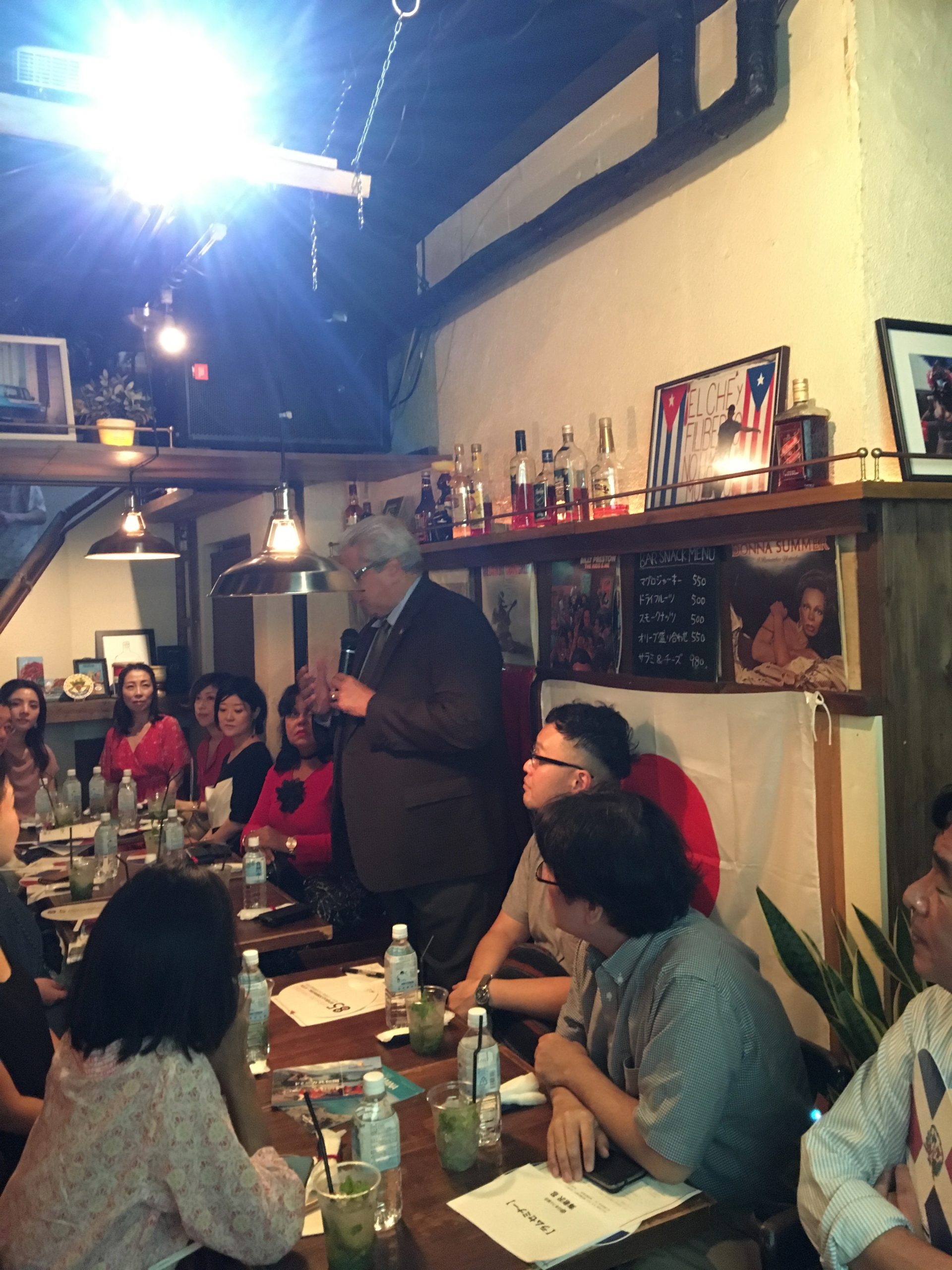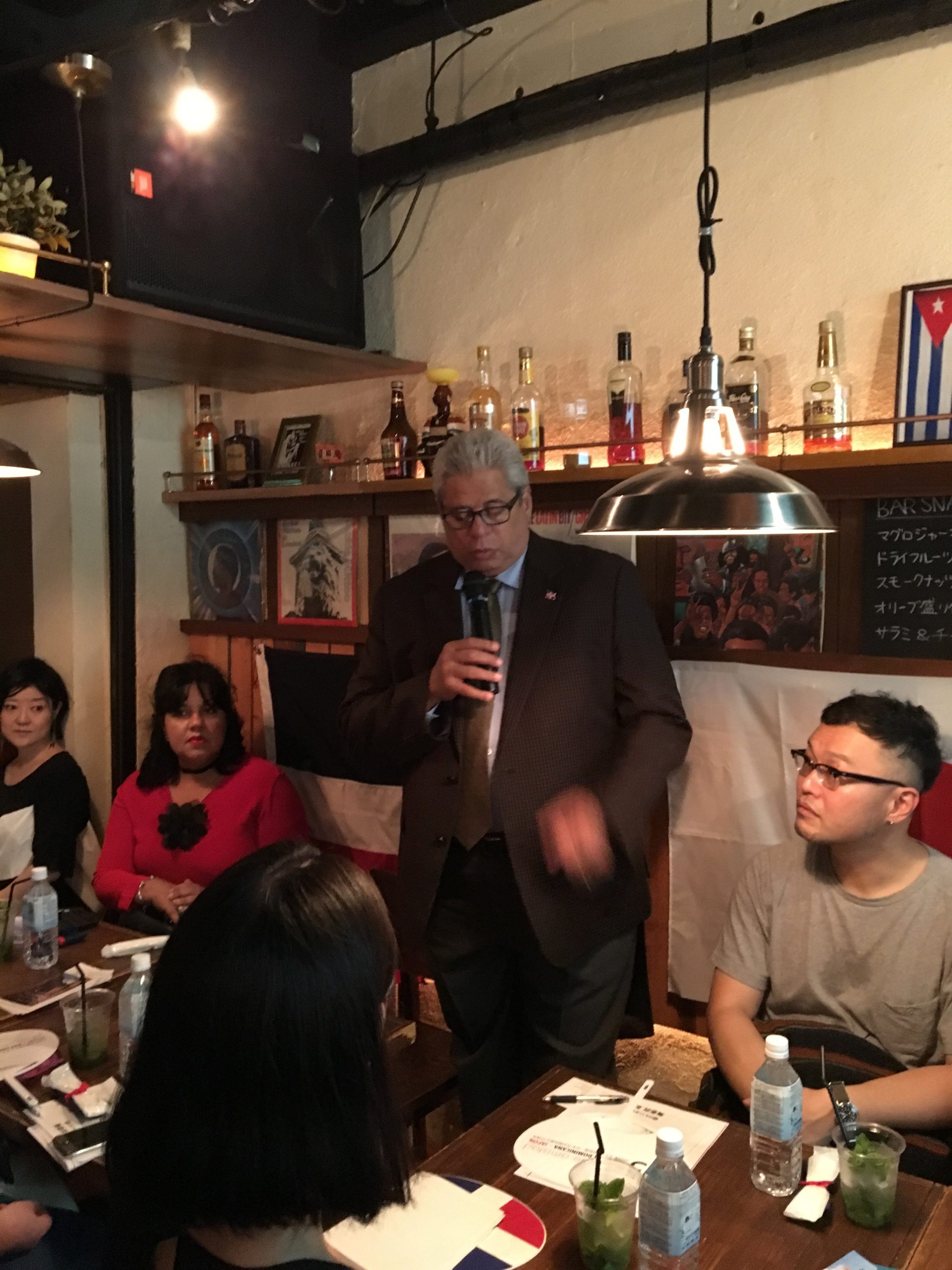 El pasado 23 de Septiembre, celebramos la primera sesión de “Gastronomía Dominicana” en ARIAPITA RUM & PUNCH bar con 26 participantes, incluido el Sr. Héctor Dominguez, el Embajador Extraordinario y Plenipotenciario ante la República Dominicana en Japón y Doña Alexandra Álvarez y ex-representante residencial de JICA en la República Dominicana, el Sr. Akihiko Yamada. Después de los saludos de apertura de Embajador Domínguez, el Sr. Wataru Suzuki, el Presidente de la Asociación de la Amistad Dominico-Japonesa brevemente presentó información básico acerca de la RD. Como un presentador principal, el Sr. Shinobu Ebinuma, el dueño del bar y el Presidente de R.U.M. JAPAN nos dio una serie de seminarios sobre ron que incluyeron sus antecedentes históricos, diferentes tipos, formas de destilación y la mejor forma de beber. También la Sra. Shiho Sugure de Lead-off Japan, Inc. y el Sr. Takuya Kobabashi de Musashi-ya, Inc. que nos han explicado acerca de sus ofertas de diferentes tipos de ron dominicanos. Los participantes se han disfrutado diferentes tipos de ron dominicanos con las comidas ligeras dominicanas como empanadas, guacamole y chips de plátano. Unos puntos importantes de la presentación por el Sr. Ebisawa eran que hay tres tipos de rones (blanco, oro y negro) y cada ron tiene características diferentes que son de formas diferentes de destilación desde ex-potencias coloniales, como Reino Unido (Scottish whiskey: rum), Francia (Coñac: rhum) y España (Jerez: ron). Muchas gracias por sus colaboración a ARIAPITA RUM & PUNCH, el Sr. Ebisawa, la Sra. Sugure, el Sr. Kobayashi y todos participantes. En el futuro, nos gustaría aumentar nuestro conocimiento de “gastronomía dominicana” con ustedes a través de los clases de puros, café, chocolate y lección de cocina dominicana! ¡Nos vemos en el próximo evento!