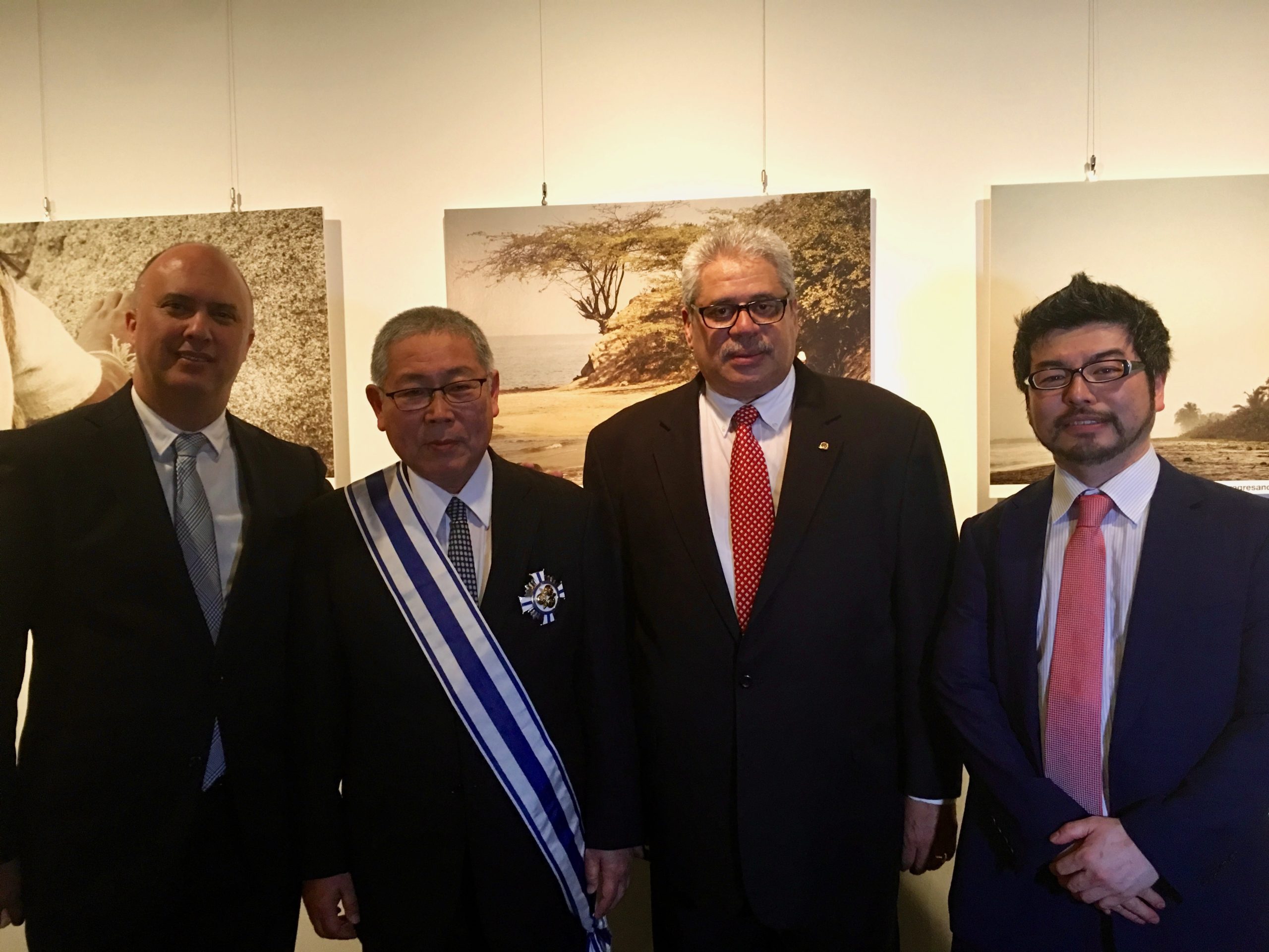 去る2月27日(火)、セルバンテス文化センターにて、駐日ドミニカ共和国大使館主催の「ドミニカ共和国独立174周年記念レセプション」が行われました。当レセプションは、二人の元・駐ドミニカ共和国日本国特命全権大使(佐藤宗一大使、淵上隆大使)の「ドゥアルテ=メジャ=サンチェス勲章」の授与式も兼ね、会場は各国外交団をはじめ、日本外務省・JICA関係者、ビジネス関係者、そして当協会会員の方々の参加もあり、満員となりました。個人的には、佐藤大使は小職の在ドミニカ共和国日本大使館時代の上司、淵上大使には小職の専門調査員職終了後も、ドミニカ共和国にて色々とお世話になったこともあり、お二人の授章は非常に感慨深いものでありました。なお、エクトール・ドミンゲス駐日ドミニカ共和国大使のご厚意もあり、乾杯の挨拶をする機会にも恵まれたほか、素晴らしいドミニカ料理と共に、多くの方々にご挨拶させて頂く事が出来、充実した一日となりました。
